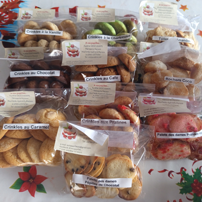 Je travaille sur commande, livraison mais aussi sur quelques marchés, foires, salons où je propose toute une gamme de biscuits secs, meringues aromatisées, cakes sucrés et salés, cannelés, caramel beurre salé, crème de pralines roses, pâte à tartiner, cookies…